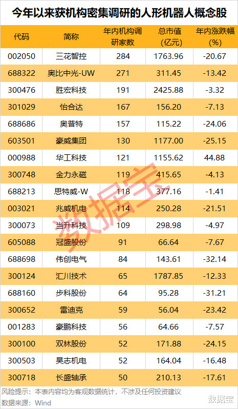 据证券时报·数据宝统计,A股东谈主形机器东谈主办法股中,年内有40余只个股获机构调研,其中35股在10家以上,三花智控、奥比中光-UW、胜宏科技、怡合达等11股调研机构致使超百家。