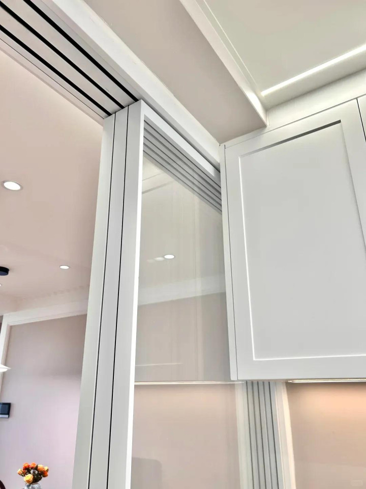推拉门是门,它还需要一个门套,门套一般有两种作念法,一种是同推拉门一样的金属套,一种是木质套。